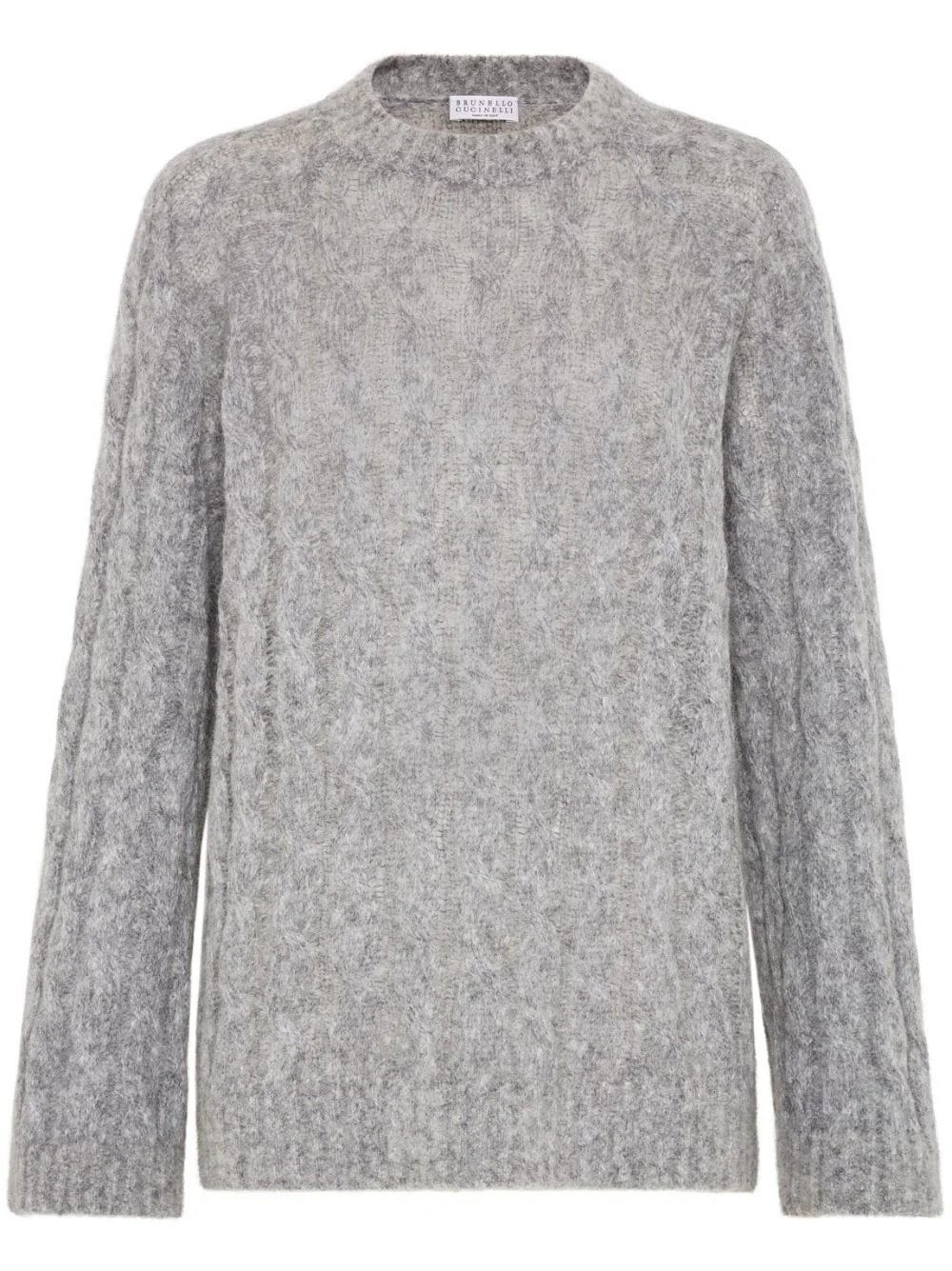 cable-knit jumper Highlights - Grey - Cable knit - Knitted construction - Crew neck - Drop shoulder - Flared cuffs - Long sleeves - Ribbed cuffs and hem Made in Italy Composition Wool 60%, Mohair 40% Washing instructions Read Manufacturer Guidelines
