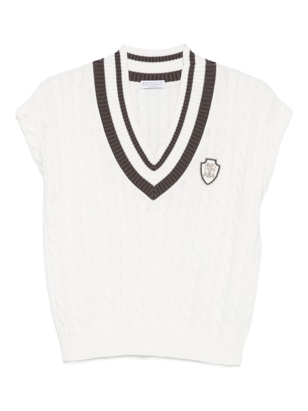 cable-knit V-neck vest Highlights - White - Cable knit - V-neck - Brown trim - Short sleeves - Emblem patch Made in Italy Composition Cotton 100% SIZE & FIT Model measurements Height 5 ft 9 in(1.75 m) Bust/Chest 32.67 in(83 cm) Hips 36.22 in(92 cm) Waist 24.8 in(63 cm) Washing instructions Hand Wash