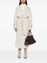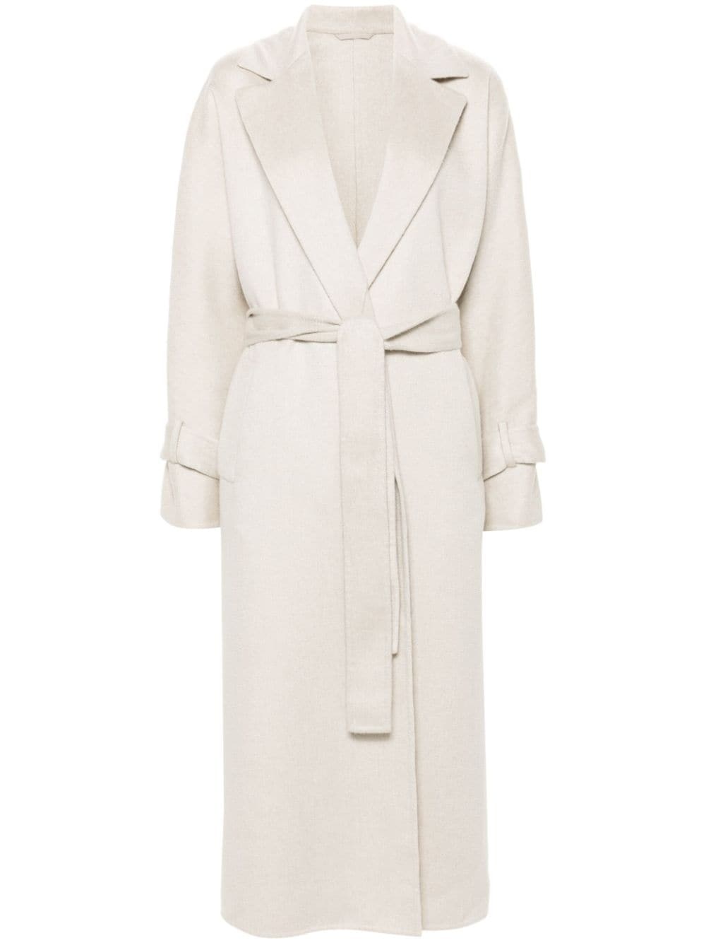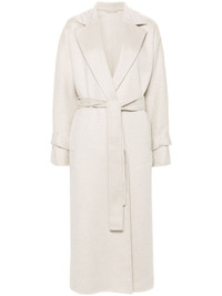 cashmere belted midi coat Highlights - Light grey - Cashmere - Felted - Notched collar - Long sleeves - Belted cuffs - Two side welt pockets - Signature monili chain detail - Side slits - Mid-length - Straight hem - Belted waist Made in Italy Composition Outer: Cashmere 100% Lining: Acetate 74%, Silk 26% SIZE & FIT Model measurements Height 5 ft 9 in(1.76 m) Bust/Chest 31.1 in(79 cm) Hips 36.61 in(93 cm) Waist 24.8 in(63 cm) FittingInformation Designed to be unstructured, offering a loose fit throughout The tie fastening gives an adaptable and personalised fit Made from a midweight non-stretch fabric This piece fits true to size – take your usual size