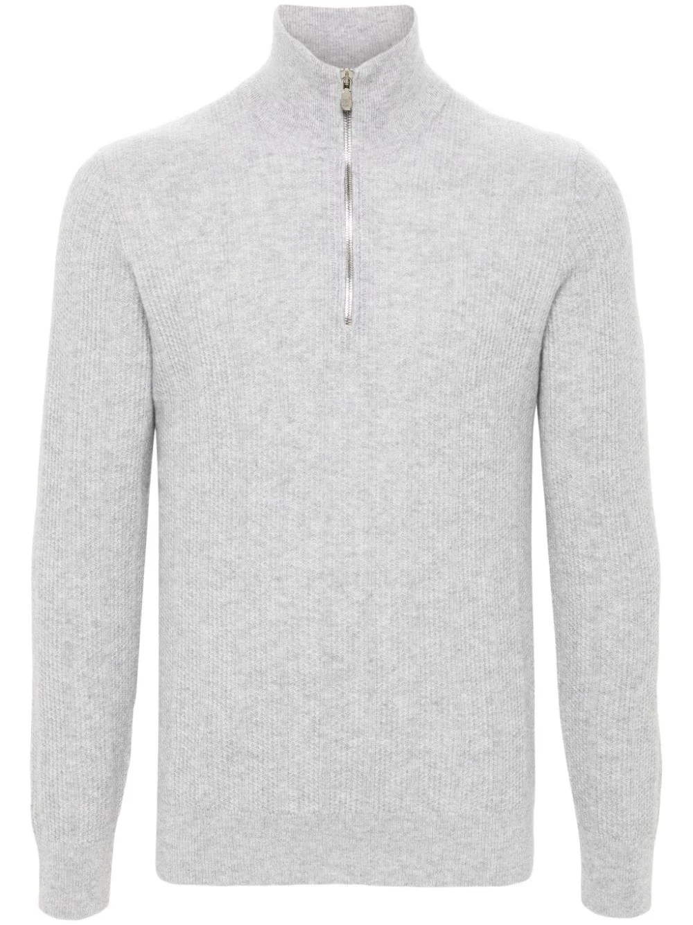 cashmere sweater Highlights - Light grey - Cashmere - Textured finish - Knitted construction - Stand-up collar - Long sleeves - Ribbed cuffs and hem - Half front zip fastening Made in Italy Composition Cashmere 100% Washing instructions Hand Wash