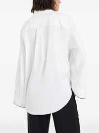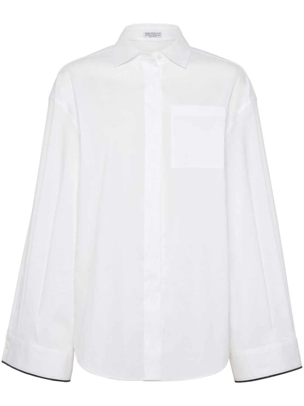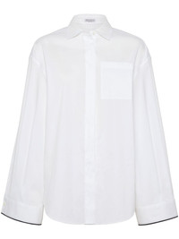 contrast-border poplin shirt Highlights - Milk white - Stretch-cotton - Poplin texture - Contrasting border - Spread collar - Front button fastening - Long sleeves - Curved hem Made in Italy Composition Cotton 72%, Polyamide 23%, Elastane 5% SIZE & FIT Measurement SLEEVE LENGTH 29.92 in(76 cm) LENGTH 29.13 in(74 cm) WAIST 47.63 in(121 cm) BUST 47.24 in(120 cm) Washing instructions Read Manufacturer Guidelines