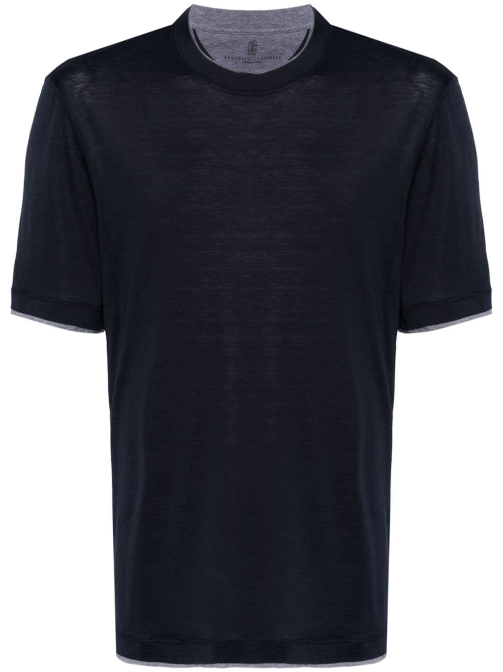 contrast-trim T-shirt This Brunello Cucinelli T-shirt embodies the brand’s uncompromising dedication to fabric and detail. It’s cut from navy silk and cotton-blend jersey with heather-grey trims to create the illusion of two pieces layered together. Highlights - Midnight blue, heather grey - Cotton-silk blend - Jersey texture - Crew neck - Short sleeves - Contrasting trim - Straight hem Made in Italy Composition Silk 62%, Cotton 38% SIZE & FIT Model measurements Height 6 ft 2 in(1.87 m) Bust/Chest 38.18 in(97 cm) Hips 36.61 in(93 cm) Waist 29.13 in(74 cm) FittingInformation Designed for a regular fit allowing for a comfortably loose fit throughout the body Made from a midweight non-stretch fabric, this piece offers minimal elasticity when worn This piece fits true to size – take your usual size