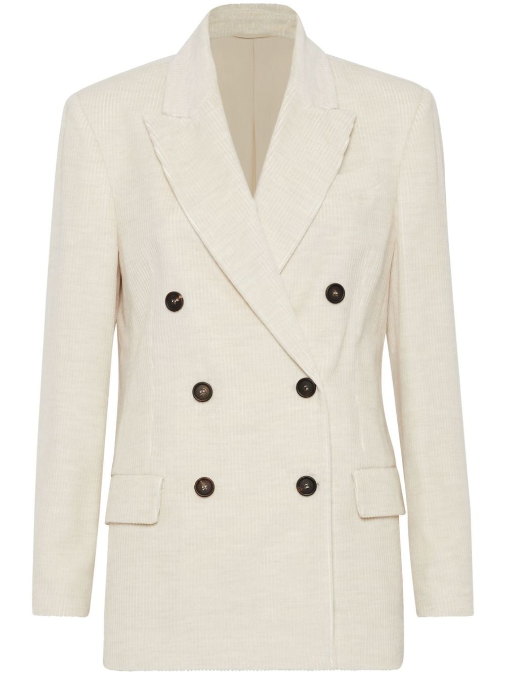 corduroy double-breasted blazer Highlights - Off-white - Corduroy - Peak lapels - Double-breasted button fastening - Two side flap pockets - Long sleeves - Straight hem - Central rear vent Made in Italy Composition Viscose 55%, Cotton 45%