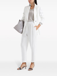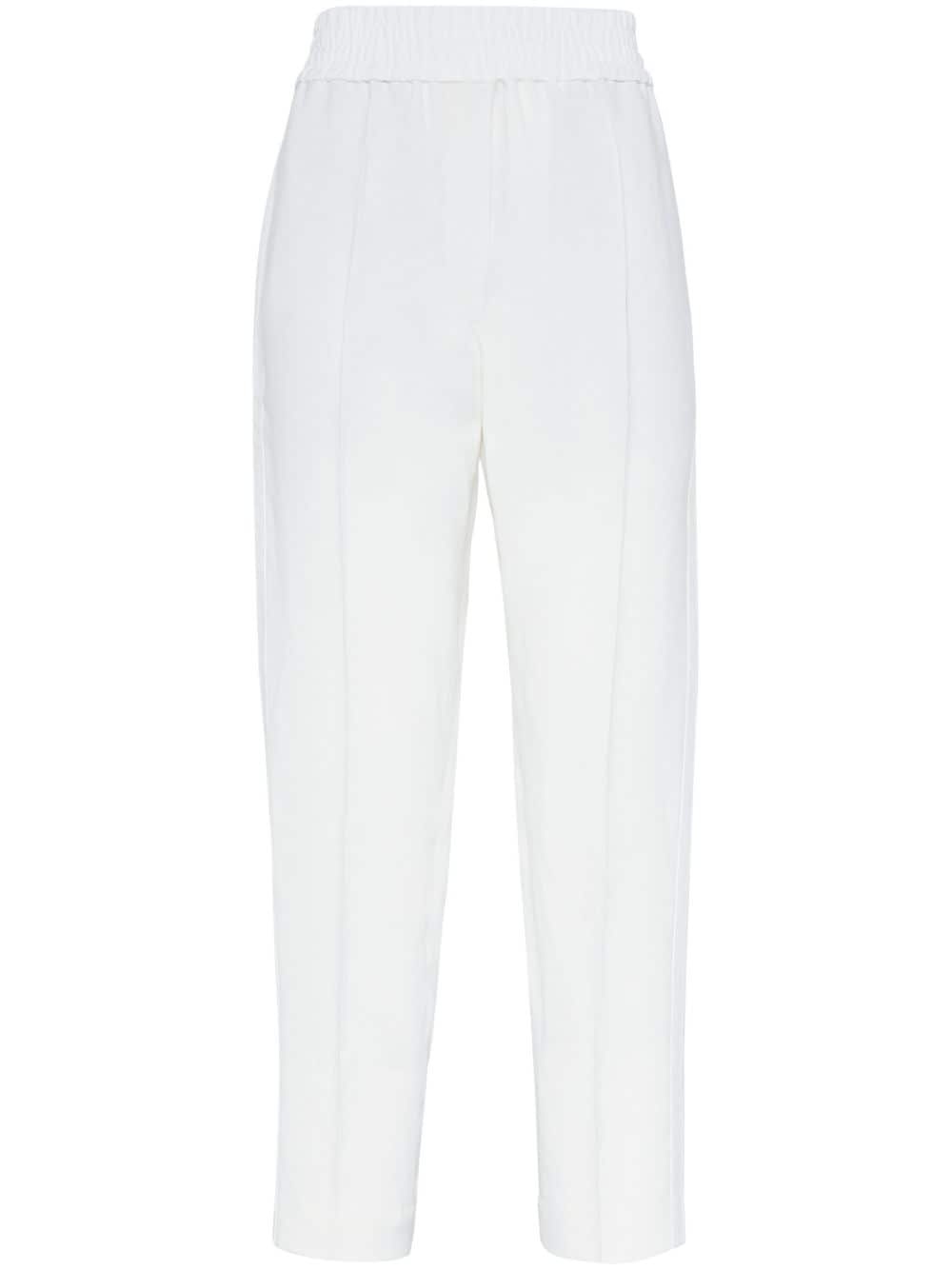 cropped tapered trousers Highlights - White - Pressed crease - Tapered leg - Elasticated waistband - Two side slash pockets - Two rear welt pockets - Ankle-length Made in Italy Composition Viscose 73%, Linen/Flax 27% Washing instructions Read Manufacturer Guidelines