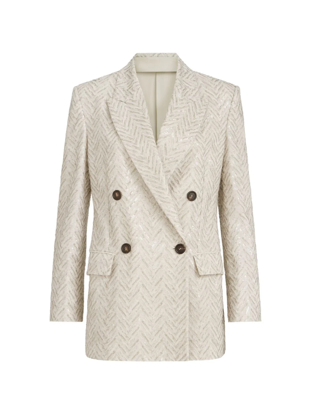 dazzling maxi chevron embroidery blazer in linen Highlights - Shiny embellishments with a timeless allure define the style of this dazzling maxi chevron embroidery blazer in linen. inspired by classic masculine elegance, the garment features pronounced shoulders and wide peak lapels which, together with the double-breasted closure, create a slightly oversized silhouette. the blazer is enriched with a refined maxi chevron embroidery that reinterprets a tailored pattern in a feminine way thanks to the delicate shimmer of sequins. - Horn button closure - Peak lapel - Silk-blend crepe lining - Hand pockets with flap - Cuffs have four horn buttons - Single back vent - Beige - Chevron embroidery - Double-breasted - Linen Made in Italy Composition Linen/Flax 100% Washing instructions Specialist Cleaning