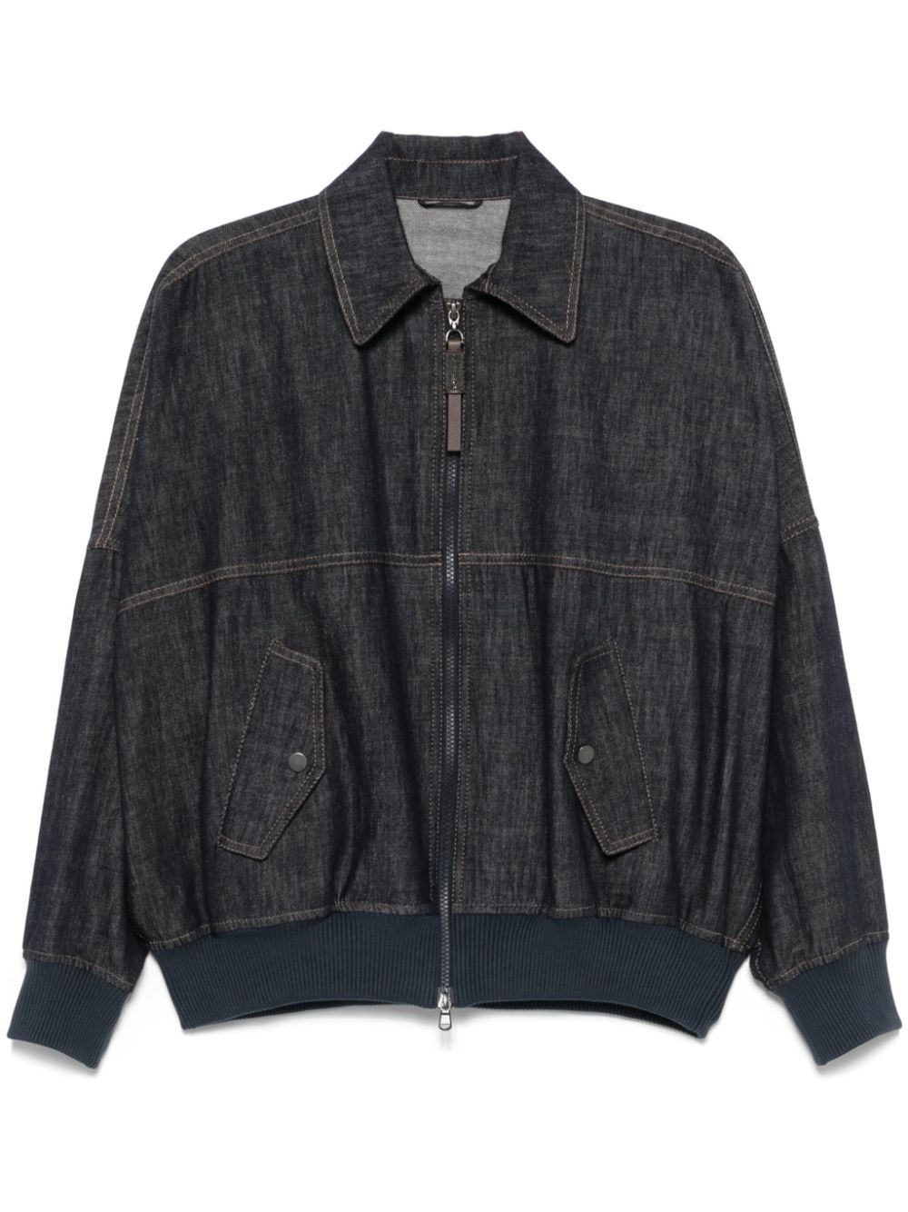 Denim-effect twill bomber jacket with shiny zipper pull