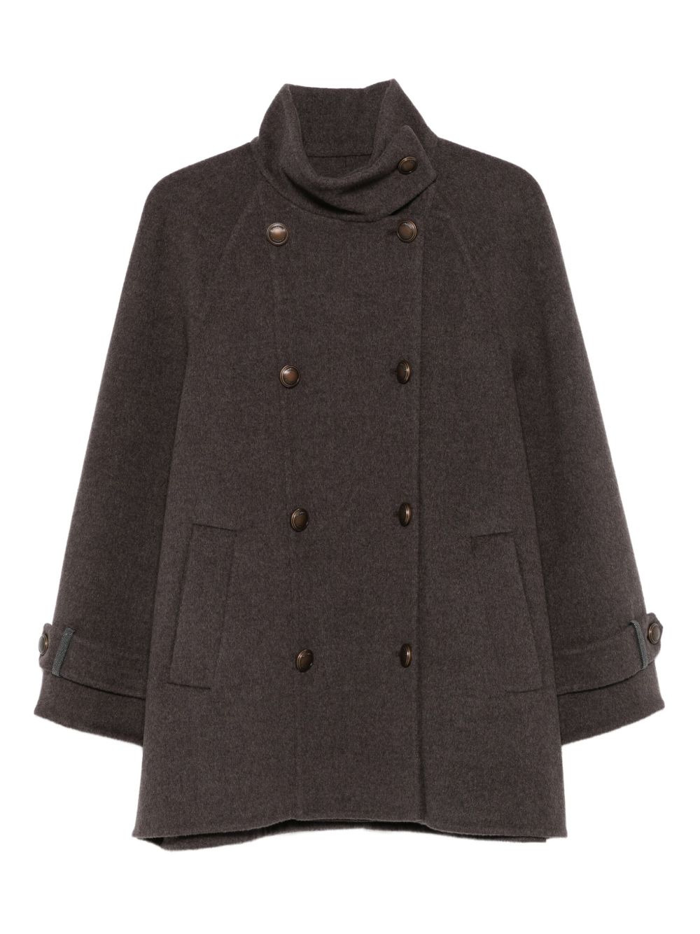 double-breasted buttoned coat Highlights - Brown - Double-breasted fastening - Button detailing - Raglan sleeves - Welt pockets - Wide cuffs Made in Italy Composition Outer: Eco Brass 100%, Virgin Wool 90%, Cashmere 10% Lining: Acetate 74%, Silk 26% SIZE & FIT Model measurements Height 5 ft 9 in(1.75 m) Bust/Chest 32.67 in(83 cm) Hips 36.22 in(92 cm) Waist 24.8 in(63 cm) Washing instructions Dry Clean Only