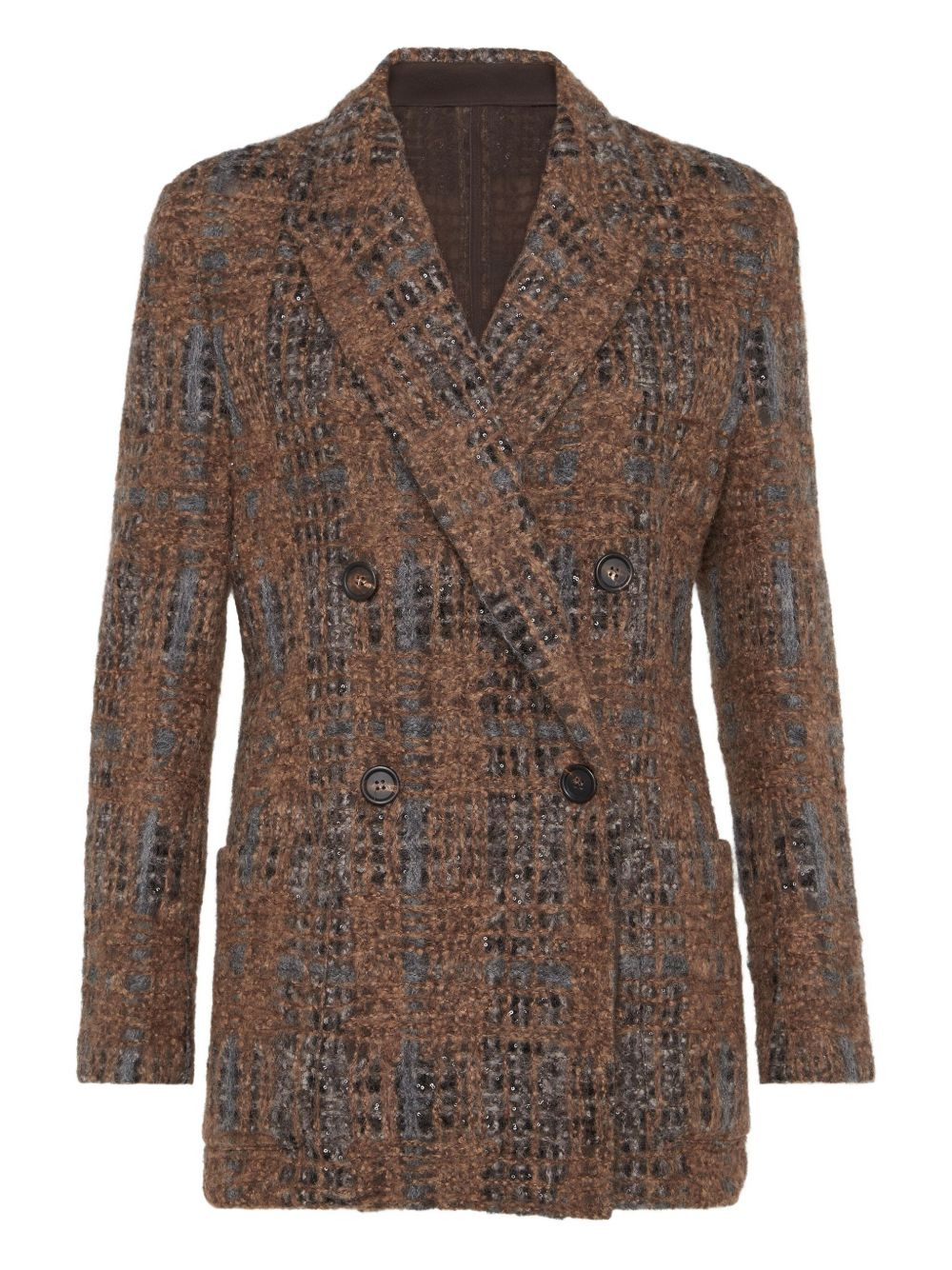 double-breasted checked blazer Highlights - Brown - Checked pattern - Double-breasted fastening - Peak lapels - Patch pockets - Long sleeves Made in Italy Composition Silk 100% Washing instructions Read Manufacturer Guidelines