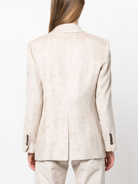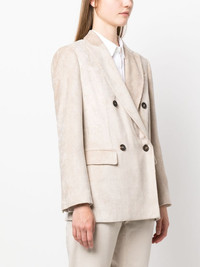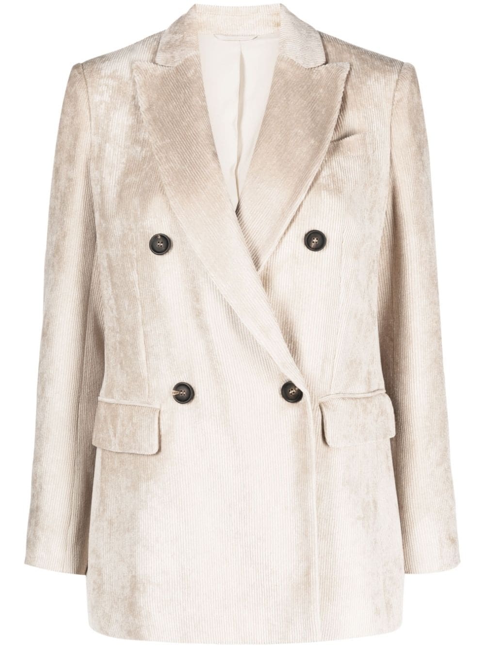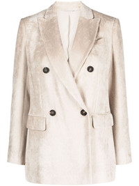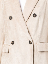 double-breasted corduroy blazer A corduroy construction lends Brunello Cucinelli’s blazer casual appeal, while the tailored silhouette demonstrates the brand’s impeccable craftsmanship. Borrowing from classic suiting, it’s cut to a double-breasted silhouette with peak lapels. Highlights - Light beige - Corduroy - Peak lapels - Double-breasted button fastening - Long sleeves - Buttoned cuffs - Chest welt pocket - Two front flap pockets - American rear vent Made in Italy Composition Outer: Viscose 100% Lining: Cupro 100%, Acetate 74%, Silk 26% SIZE & FIT Model measurements Height 5 ft 9 in(1.75 m) Bust/Chest 31.1 in(79 cm) Hips 33.46 in(85 cm) Waist 23.22 in(59 cm) Measurement SLEEVE LENGTH 23.62 in(60 cm) LENGTH 28.34 in(72 cm) FittingInformation Designed for a slim fit that sits just away from the body offering a close yet comfortable fit The vented hem offers movement at the rear Made from a midweight non-stretch fabric This piece fits true to size – take your usual size Washing instructions Dry Clean Only