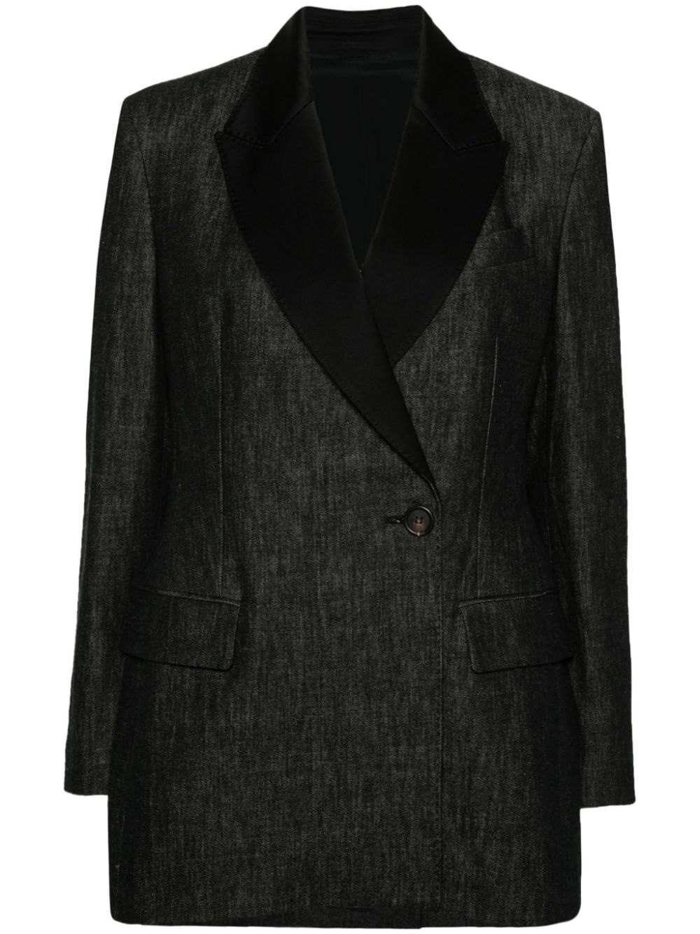 double-breasted denim blazer Highlights - Black - Cotton - Denim - Satin trim - Notched lapels - Shoulder pads - Long sleeves - Buttoned-cuff sleeves - Chest welt pocket - Two side flap pockets - Central rear vent - Full lining - Straight hem - Double-breasted button fastening Made in Italy Composition Outer: Cotton 100%, Acetate 61%, Viscose 39% Lining: Acetate 74%, Silk 26% SIZE & FIT Model measurements Height 5 ft 10 in(1.77 m) Bust/Chest 32.28 in(82 cm) Hips 35.03 in(89 cm) Waist 25.19 in(64 cm) FittingInformation Designed for a slim fit that sits just away from the body offering a close yet comfortable fit The internal shoulder pads offer a structured shape Made from a midweight non-stretch fabric This piece fits true to size – take your usual size Washing instructions Dry Clean Only