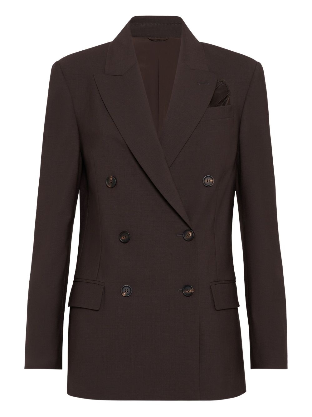 double-breasted tailored blazer Highlights - Dark brown - Peak lapels - Button fastening - Front pockets - Internal pocket Made in Italy Composition Virgin Wool 75%, Nylon 23%, Fabric 2% Washing instructions Read Manufacturer Guidelines