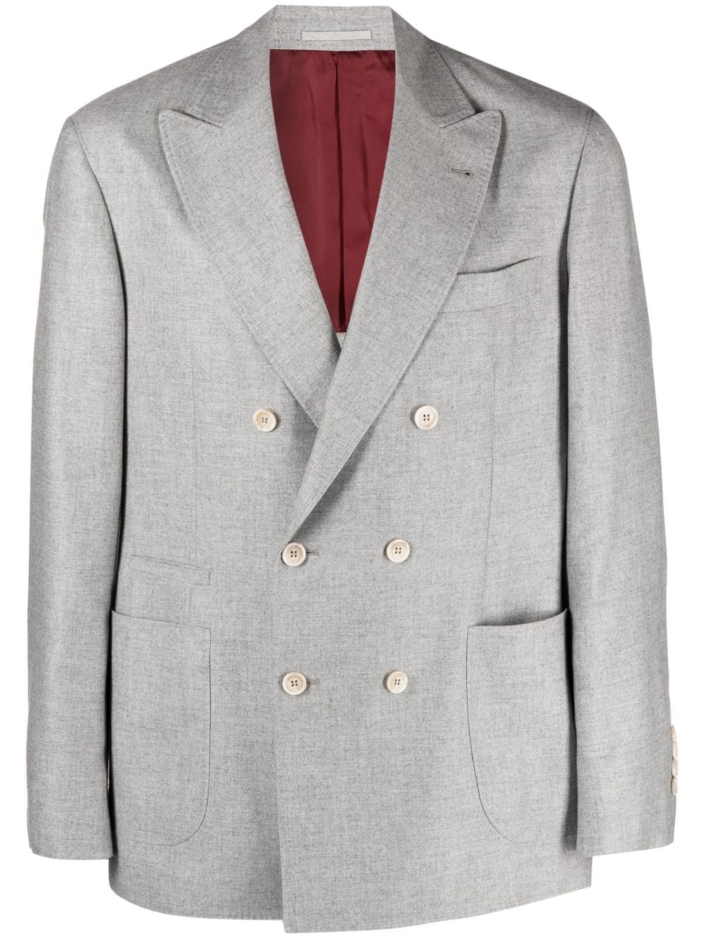 double breasted wool blazer Favouring timeless styles, Brunello Cucinelli introduces this light grey blazer. Crafted from a cashmere-silk blend, its traditional double-breasted silhouette showcases the Italian brand's meticulous tailoring. Highlights - Light grey - Cashmere-silk blend - Peak lapels - V-neck - Chest welt pocket - Double-breasted button fastening - Long sleeves - Buttoned cuffs - Front jetted pocket - Two front patch pockets - Curved hem Made in Italy Composition Outer: Cashmere 92%, Silk 8% Lining: Cupro 100% SIZE & FIT Model measurements Height 6 ft 1 in(1.86 m) Bust/Chest 37.4 in(95 cm) Hips 34.64 in(88 cm) Waist 29.13 in(74 cm) FittingInformation Designed for a boxy fit, intended for a loose fit throughout The vented hem offers movement at the rear Made from a midweight non-stretch fabric This piece fits true to size – take your usual size