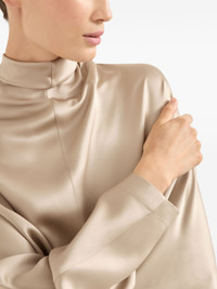 double silk satin blouse Highlights - Taupe smoke - Silk satin - Mock neck - Long sleeves - Rear zip fastening - Tonal stitching Made in Italy Composition Silk 100% Washing instructions Specialist Cleaning