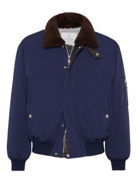 down bomber jacket Highlights - Indigo blue - Front press-stud and zip fastening - Two side welt pockets - Shearling collar - Ribbed cuffs and hem Made in Italy Composition Outer: Sheep Skin/Shearling 100%, Nylon 88%, Elastane 12% Lining: Goose Feather 100%