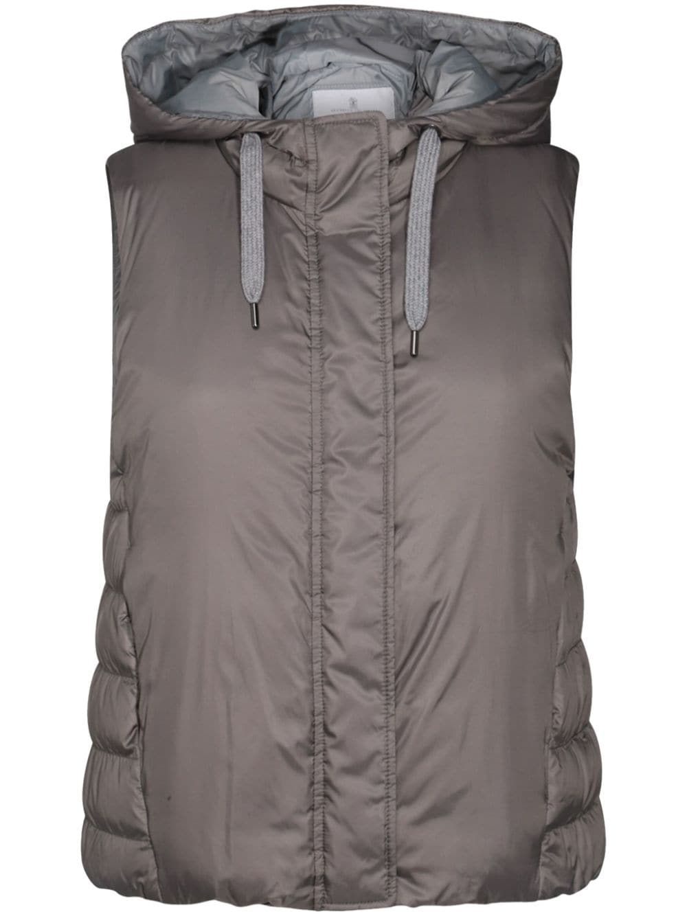drawstring padded gilet Highlights - Grey - Feather down - Padded design - Concealed front fastening - Drawstring hood - Sleeveless - Straight hem Made in Italy Composition Outer: Polyester 100% Lining: Nylon 100%, Polyester 100%, Down 90%, Feather 10%