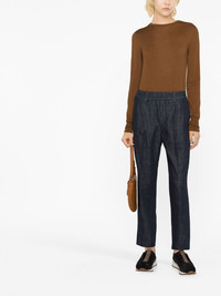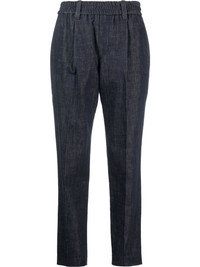 elasticated-waist trousers These trousers from Brunello Cucinelli are a hybrid design borrowing elements from classic jeans and tailored styles. Crafted from cotton denim, the elasticated waistband plays host to belt loops, while the straight legs are structured by pressed creases. Made in Italy Composition Outer: Cotton 100% Lining: Cotton 100% SIZE & FIT Model measurements Height 5 ft 9 in(1.75 m) Bust/Chest 31.88 in(81 cm) Hips 33.85 in(86 cm) Waist 24.01 in(61 cm) FittingInformation This piece fits true to size. We recommend you get your regular size Designed to be fitted at the waist and hips, loose over the leg Made with a mid-weight non-stretch fabric Washing instructions Machine Wash