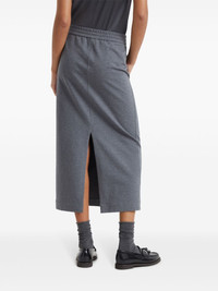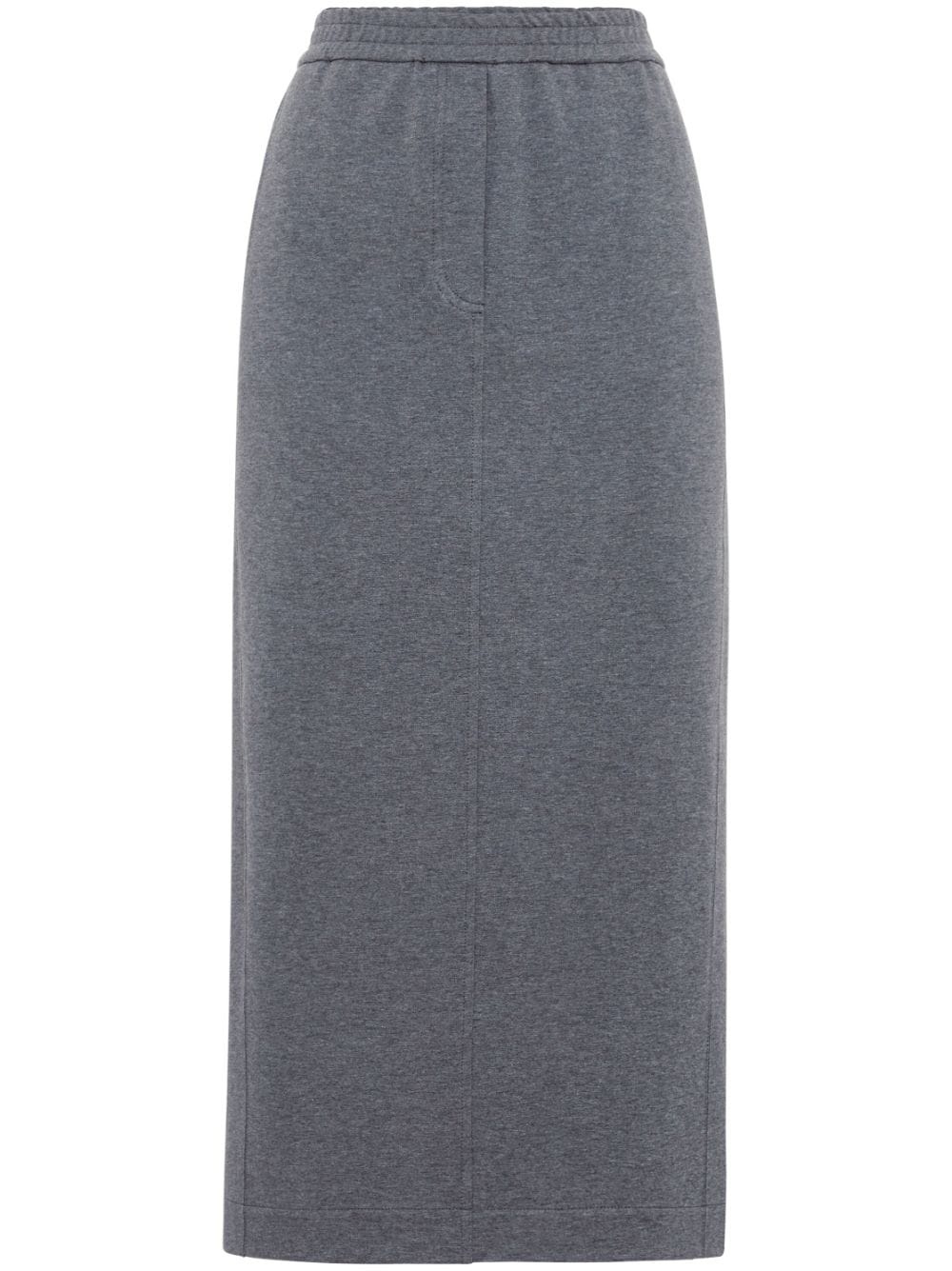elasticated-waistband midi skirt True to the brand's 'sportivo chic' aesthetic, this heather-grey Brunello Cucinelli skirt is cut from cotton with a hint of stretch to a minimalist mid-length silhouette. An elasticated waistband and side pockets complete it, lending a functional element. Highlights - Heather grey - Stretch-cotton - Elasticated waistband - Two side welt pockets - Rear slit - Straight hem - Mid-length Made in Italy Composition Cotton 98%, Elastane 2%