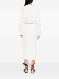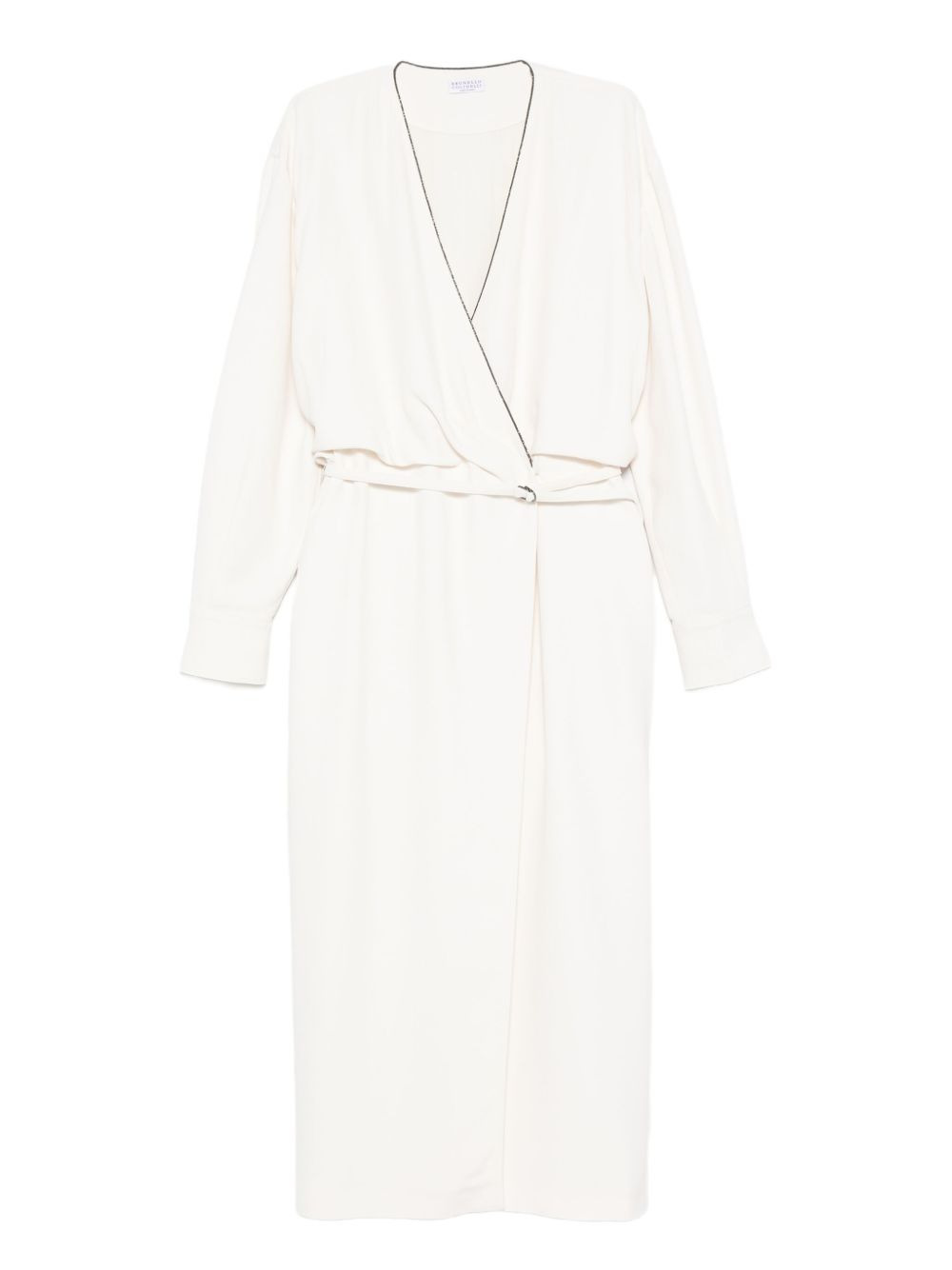 embellished wrap dress Highlights - White - Self-tie belt - Midi length - Metallic trim Made in Italy Composition Eco Brass 100%, Acetate 52%, Silk 48% SIZE & FIT Model measurements Height 5 ft 10 in(1.78 m) Bust/Chest 33.46 in(85 cm) Hips 36.22 in(92 cm) Waist 23.22 in(59 cm) Washing instructions Dry Clean Only