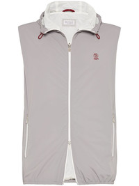 embroidered logo vest Highlights - Grey - Two-way zip fastening - Two side zip-fastening pockets - Drawstring hood - Sleeveless Made in Italy Composition Nylon 83%, Elastane 17% Washing instructions Specialist Cleaning
