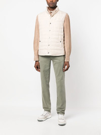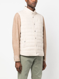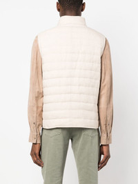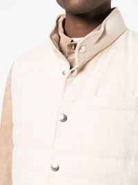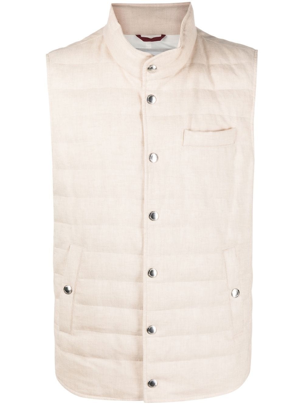feather-down padded gilet Showcasing Brunello Cucinelli's penchant for minimalist design, this gilet appears in an all-over cream colourway. The focus is on the cotton and linen classic quilted construction. Highlights - Light pink - Down-feather filling - Linen-wool blend - High neck - Sleeveless - Chest pocket - Front button fastening - Two side button-fastening pockets - Straight hem Made in Italy Composition Outer: Linen/Flax 60%, Wool 40% Lining: Polyamide 100%, Feather Down 100% SIZE & FIT Model measurements Height 6 ft 2 in(1.88 m) Bust/Chest 36.61 in(93 cm) Hips 35.82 in(91 cm) Waist 27.95 in(71 cm) FittingInformation This piece fits true to size. We recommend you get your regular size Cut for a slim fit Made with a mid-weight non-stretch fabric