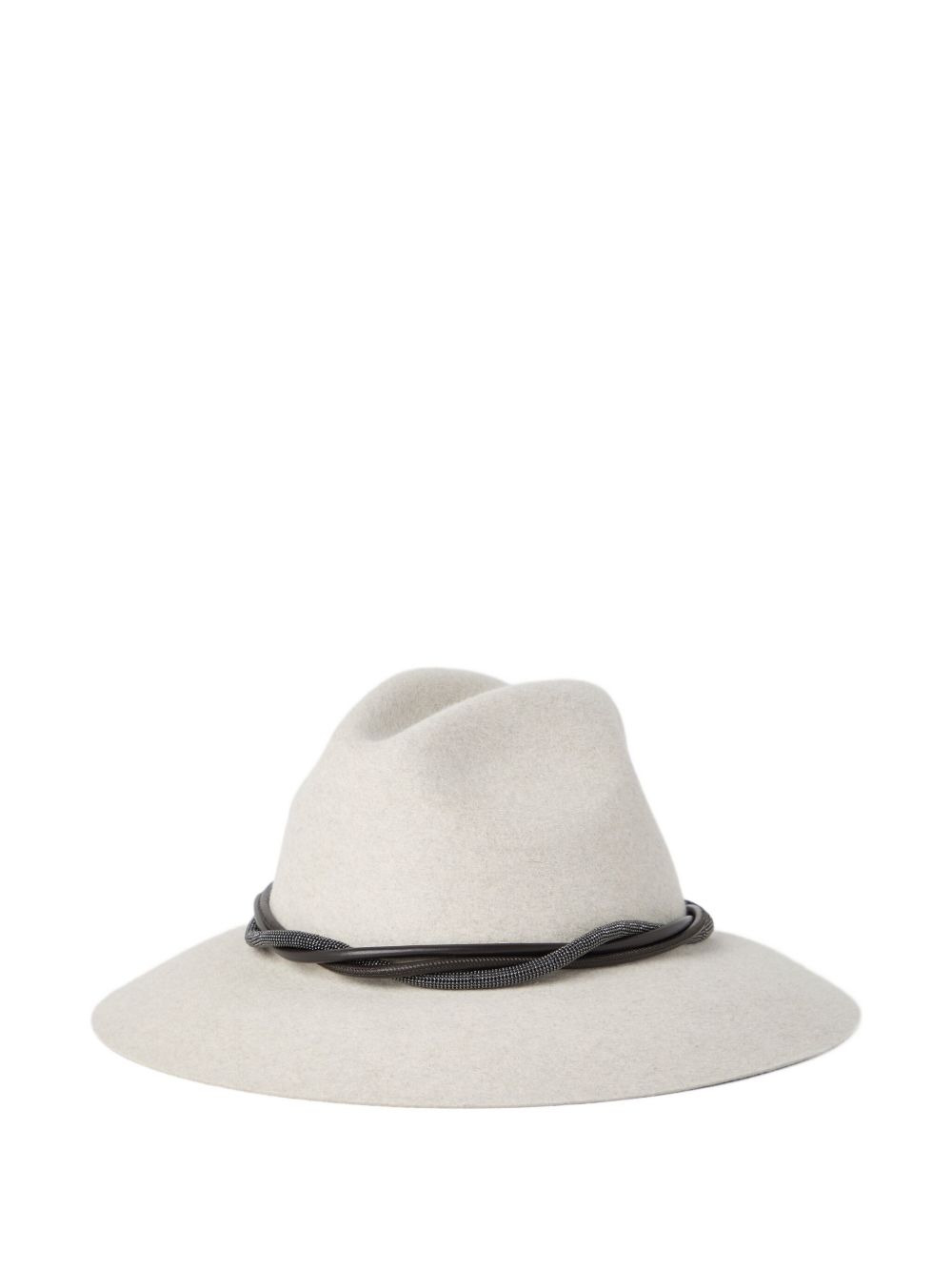 felt fedora Highlights - Light grey - Felt material - Wide brim - Braided leather band - Monili beaded detailing - Twisted band design Made in Italy Composition Felt 100% Washing instructions Read Manufacturer Guidelines
