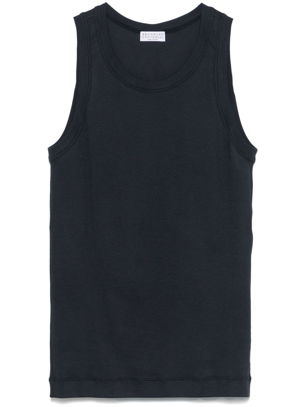 fine-ribbed tank top Highlights - Midnight blue - Crew neck - Sleeveless Made in Italy Composition Eco Brass 100%, Cotton 94%, Elastane 6% SIZE & FIT Model measurements Height 5 ft 10 in(1.78 m) Bust/Chest 31.49 in(80 cm) Hips 37 in(94 cm) Waist 23.62 in(60 cm) FittingInformation Designed for a slim fit that sits just away from the body offering a close yet comfortable fit Made from a midweight stretch fabric, this piece offers elasticity and flexibility when worn Washing instructions Hand Wash