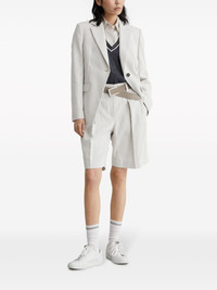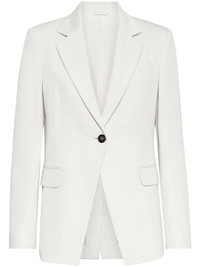 gabardine-weave single-breasted blazer Brunello Cucinelli explores classic silhouettes with this light-grey blazer. It's cut in Italy from a blend of cotton and linen yarns to a single-breasted silhouette with notched lapels and front flap pockets for timeless appeal. Highlights - White - Cotton/linen - Gabardine weave - Notched lapels - Front button fastening - Long sleeves - Buttoned cuffs - Chest welt pocket - Two front flap pockets - American rear vent - Straight hem Made in Italy Composition Wool 100%, Cotton 80%, Linen/Flax 20% SIZE & FIT Measurement SLEEVE LENGTH 23.62 in(60 cm) HIPS 38.58 in(98 cm) LENGTH 27.55 in(70 cm) WAIST 33.85 in(86 cm) Washing instructions Read Manufacturer Guidelines