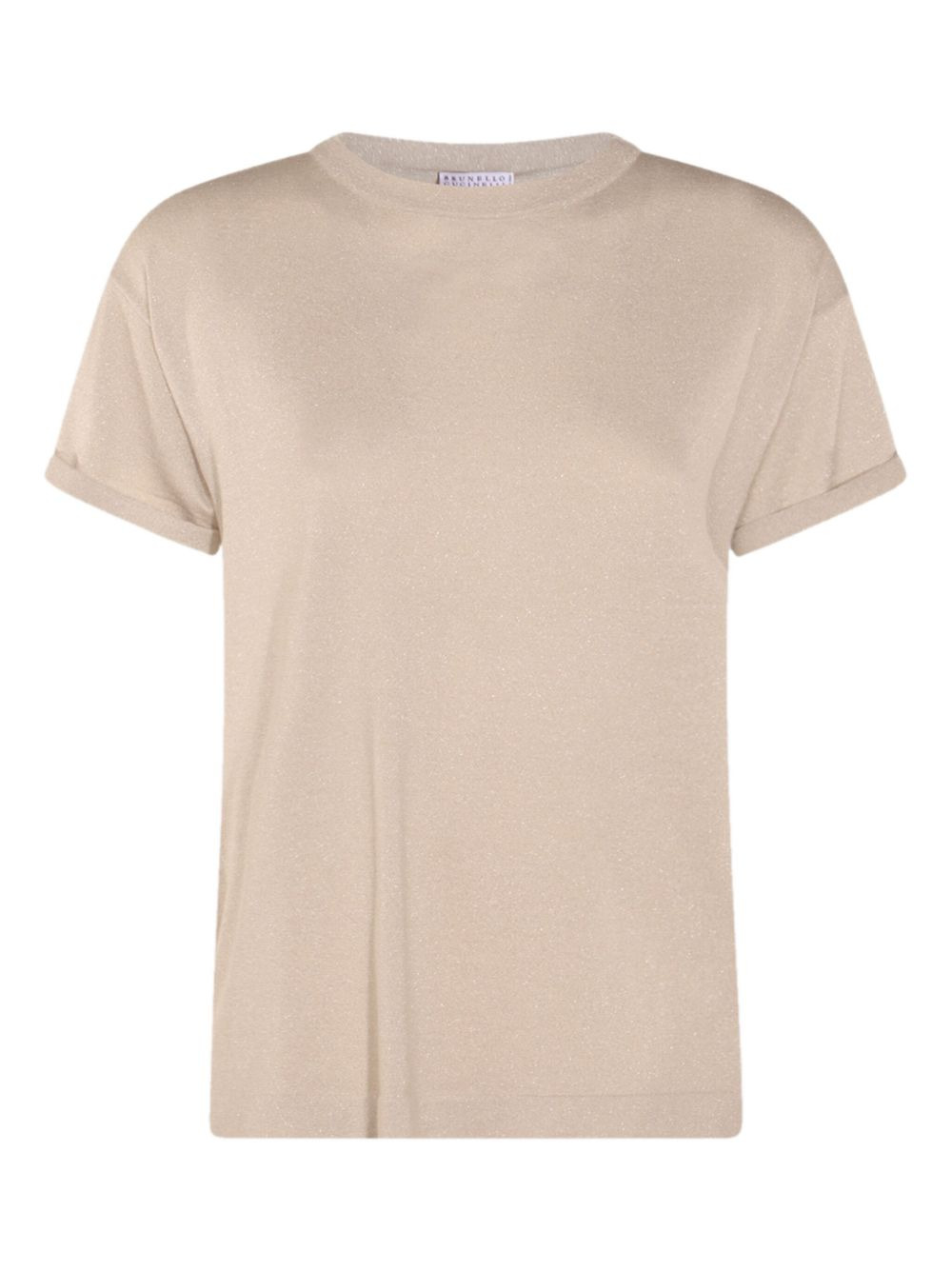 glitter-effect short-sleeve top Highlights - Mother-of-pearl beige - Glitter effect - Short sleeves - Round neck - Cuffed sleeves Made in Italy Composition Cotton 100% Washing instructions Read Manufacturer Guidelines