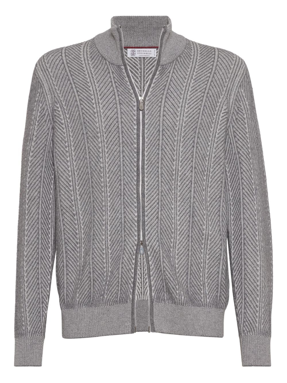 herringbone-pattern cardigan Highlights - Medium grey - Front two-way zip fastening - Ribbed cuffs and hem - Long sleeves - Mock neck Made in Italy Composition Cashmere 100%