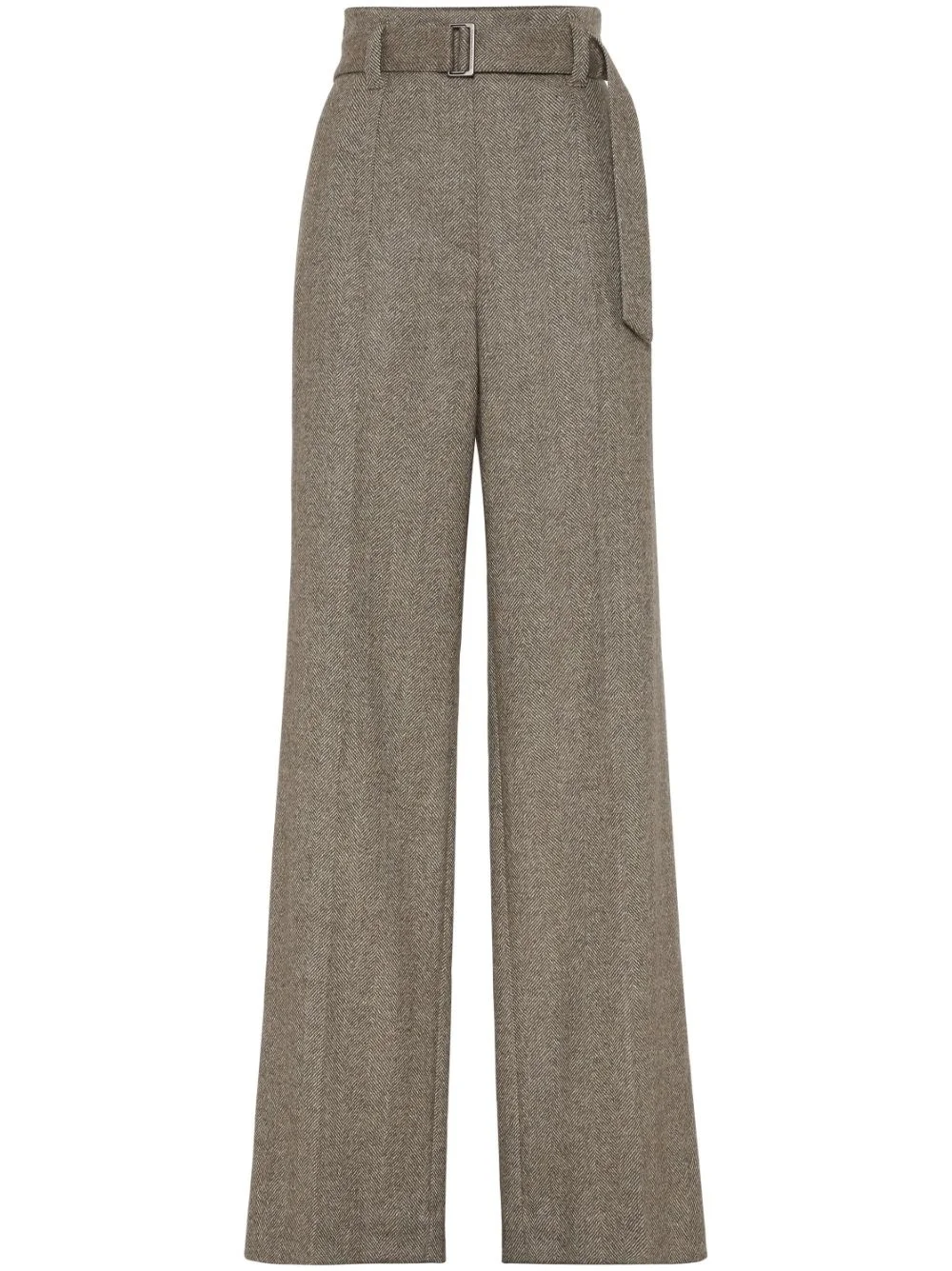 herringbone-pattern pressed-crease trousers Highlights - Taupe brown - Virgin wool blend - Herringbone pattern - Pressed crease - Detachable and adjustable waist belt - Two side slash pockets - Two rear welt pockets - Front zip fastening - Belt loops - Long length - Straight hem Made in Italy Composition Virgin Wool 51%, Wool 36%, Polyamide 12%, Elastane 1% SIZE & FIT Measurement FRONT RISE 13.77 in(35 cm) INSIDE LEG 33.85 in(86 cm) HIPS 41.73 in(106 cm) WAIST 32.28 in(82 cm)