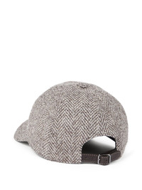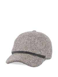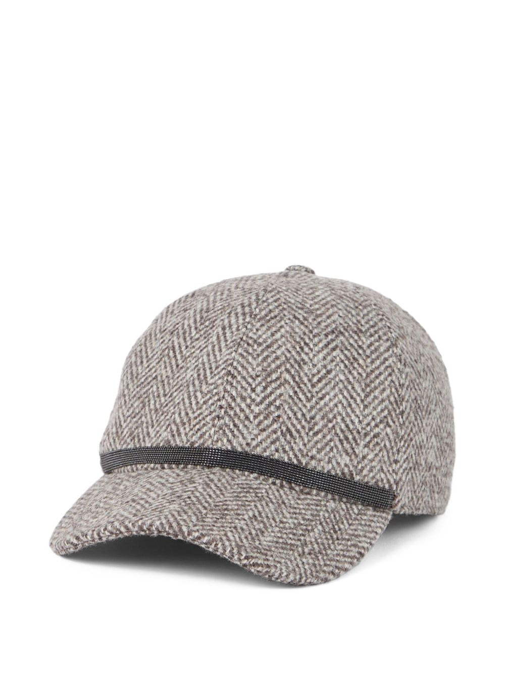 herringbone tweed baseball cap Highlights - Brown - Herringbone pattern - Monili beaded trim - Leather buckle-fastening strap - Baseball cap style Made in Italy Composition Virgin Wool 73%, Nylon 27% Washing instructions Specialist Cleaning