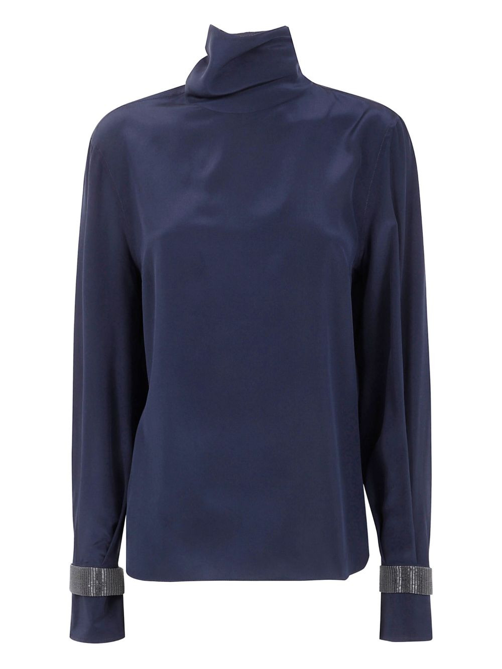 high-neck embellished-cuff blouse Highlights - Blue - High neck - Keyhole back detail - Long sleeves - Embellished cuffs - Silk Imported Composition Silk 100% Washing instructions Read Manufacturer Guidelines