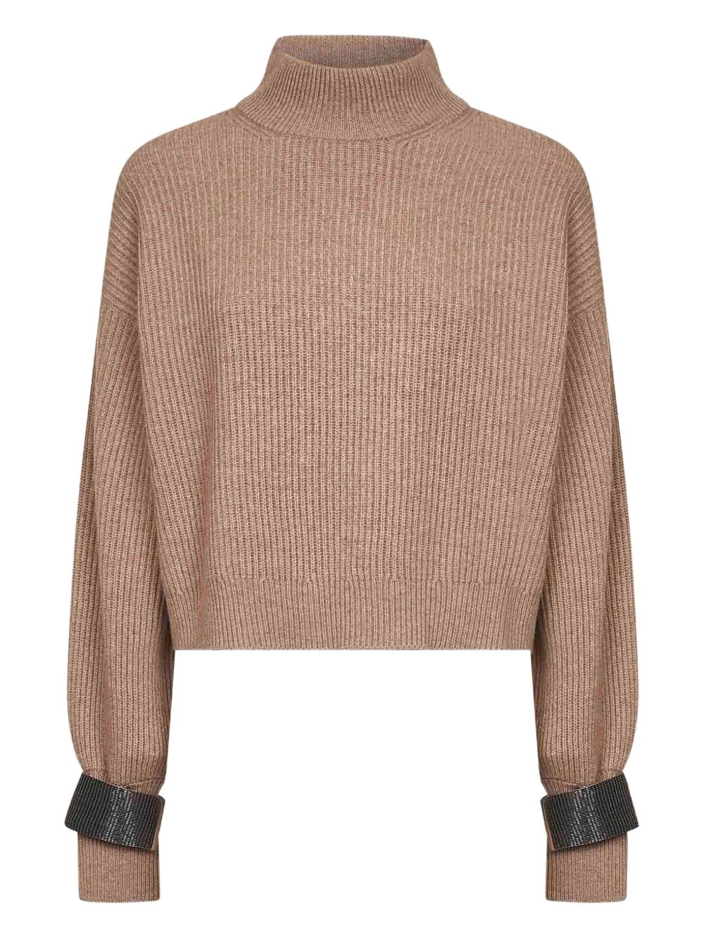 high-neck embellished-cuff sweater Highlights - Brown - Ribbed high collar - Long sleeves - Dropped shoulders - Embroidered cuff straps Made in Italy Composition Cashmere 100% Washing instructions Read Manufacturer Guidelines