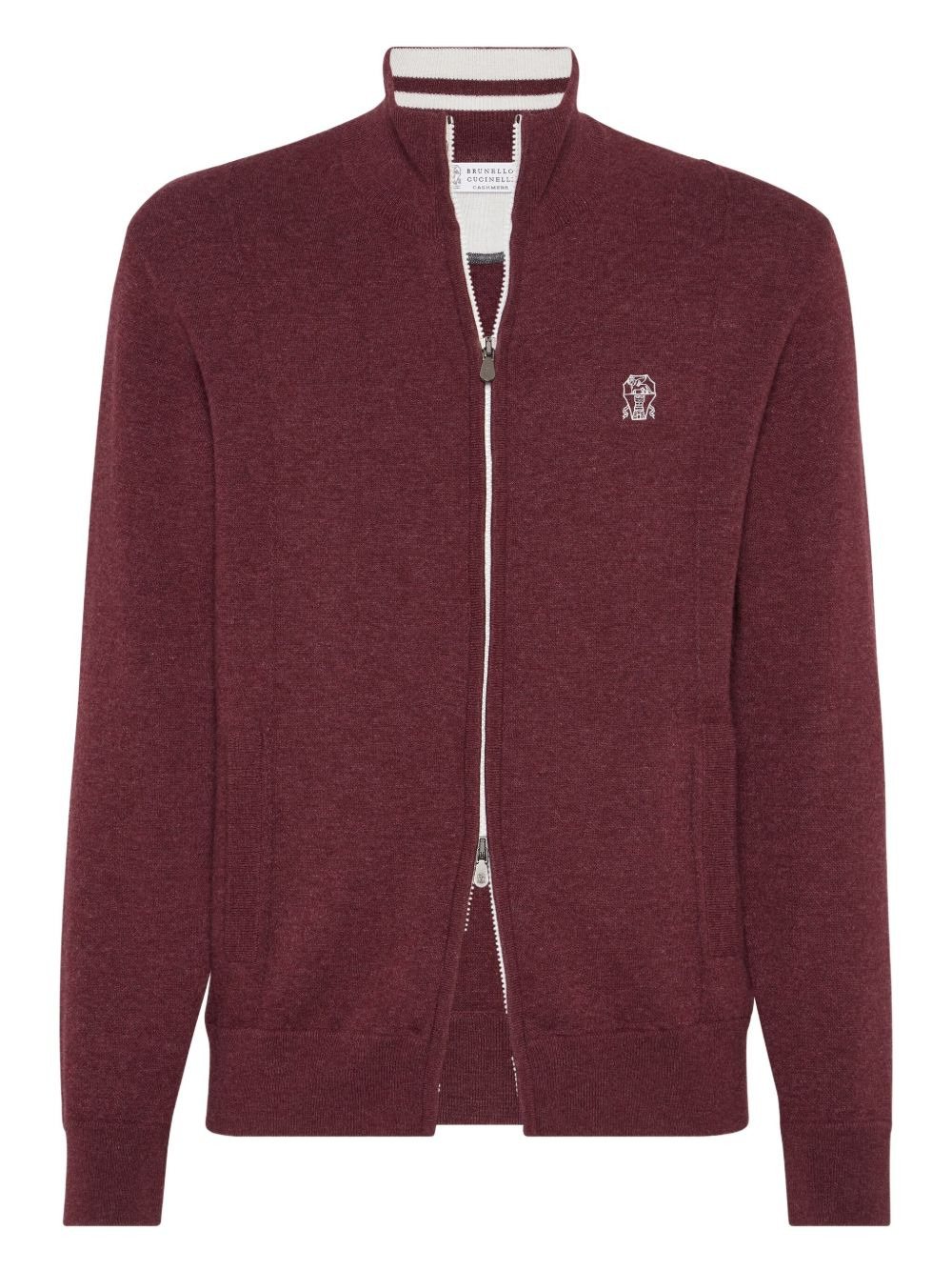 high-neck zip-up cardigan Highlights - Dark red - High neck - Zip fastening - Ribbed hem - Embroidered logo - Long sleeves Made in Italy Composition Cashmere 96%, Nylon 3%, Elastane 1% Washing instructions Hand Wash