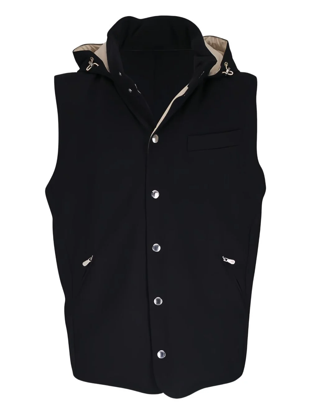 hooded button vest Highlights - Black - Button fastening - Chest pocket - Zip-fastening pockets - Hood Made in United States Composition Outer: Wool 100% Lining: Down 90%, Feather 10% Washing instructions Dry Clean Only