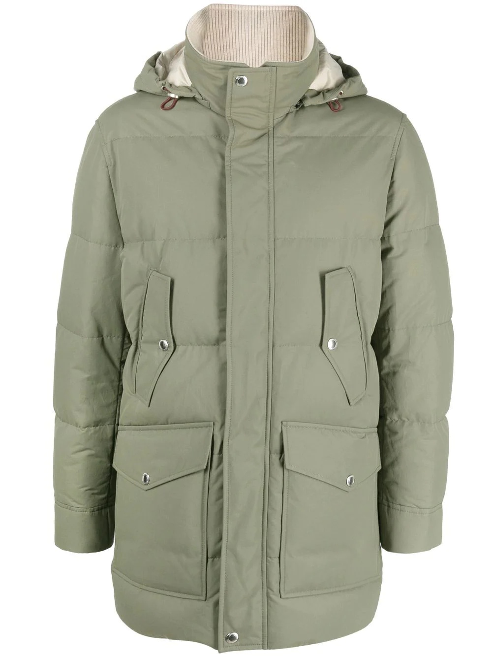 hooded padded coat Brunello Cucinelli's heritage is producing functional designs that are suitable for everyday wear. This is finely demonstrated through this long-sleeve coat, which is detailed with goose-down filling and a drawstring hood for added insulation. In addition, this design is elevated by multiple pockets for a practical finish. Made in Italy Composition Outer: Cotton 64%, Virgin Wool 60%, Nylon 36%, Cashmere 30%, Silk 10% Lining: Nylon 100%, Polyamide 100%, Polyester 100%, Cotton 100%, Goose Down 90%, Feather 10% SIZE & FIT Model measurements Height 6 ft 2 in(1.87 m) Bust/Chest 36.41 in(92.5 cm) Hips 35.43 in(90 cm) Waist 29.52 in(75 cm) FittingInformation This piece fits true to size. We recommend you get your regular size Cut for a loose fit Made with a mid-weight non-stretch fabric Washing instructions Dry Clean Only