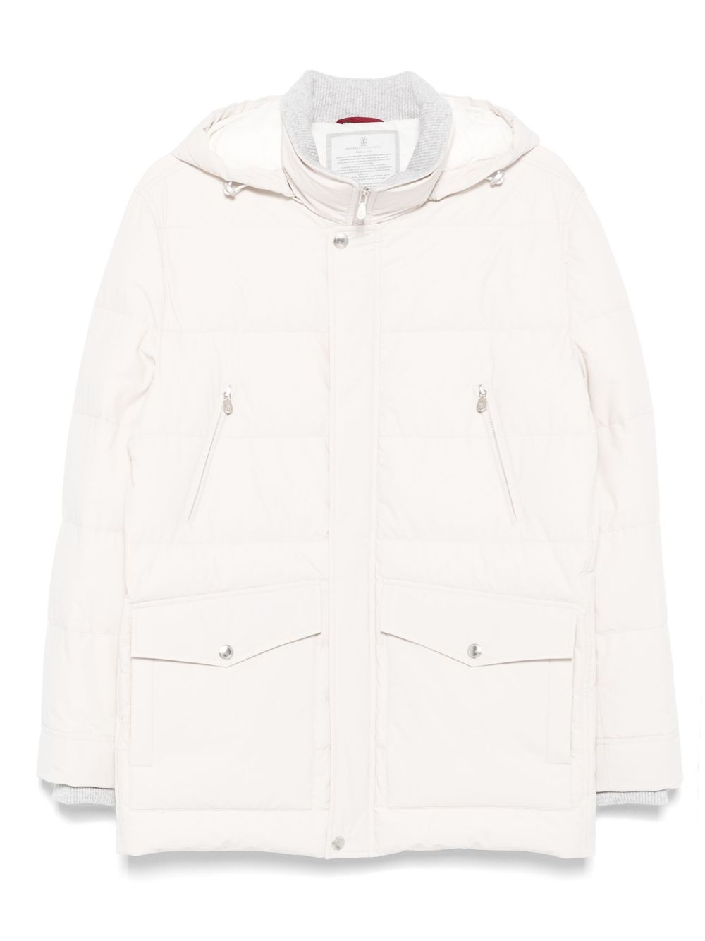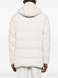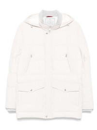 hooded puffer jacket Highlights - Off-white - Front zip fastening - Front press-stud fastening - Detachable hood - Two front flap pockets Made in Italy Composition Outer: Polyamide 87%, Virgin Wool 60%, Cashmere 30%, Elastane 13%, Silk 10% Lining: Nylon 100%, Cotton 100%, Goose Down 90%, Goose Feather 10% SIZE & FIT Model measurements Height 6 ft 0 in(1.84 m) Bust/Chest 35.82 in(91 cm) Hips 37 in(94 cm) Waist 28.34 in(72 cm) FittingInformation Designed for a regular fit, allowing for a comfortably loose fit throughout the body The vented hem offers movement at the rear Made from a padded non-stretch fabric, giving it no natural elasticity Washing instructions Dry Clean Only