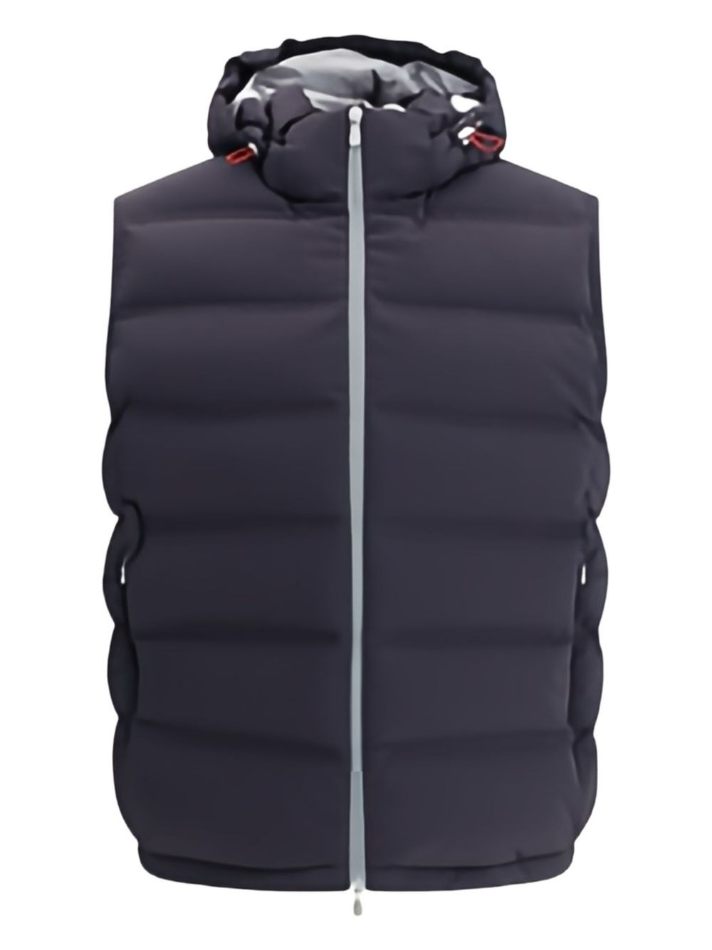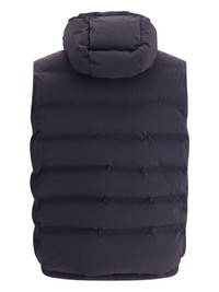 hooded quilted gilet Highlights - Dark blue - Quilted design - Front zip fastening - Drawstring hood - Sleeveless Made in Italy Composition Polyester 100% Washing instructions Read Manufacturer Guidelines