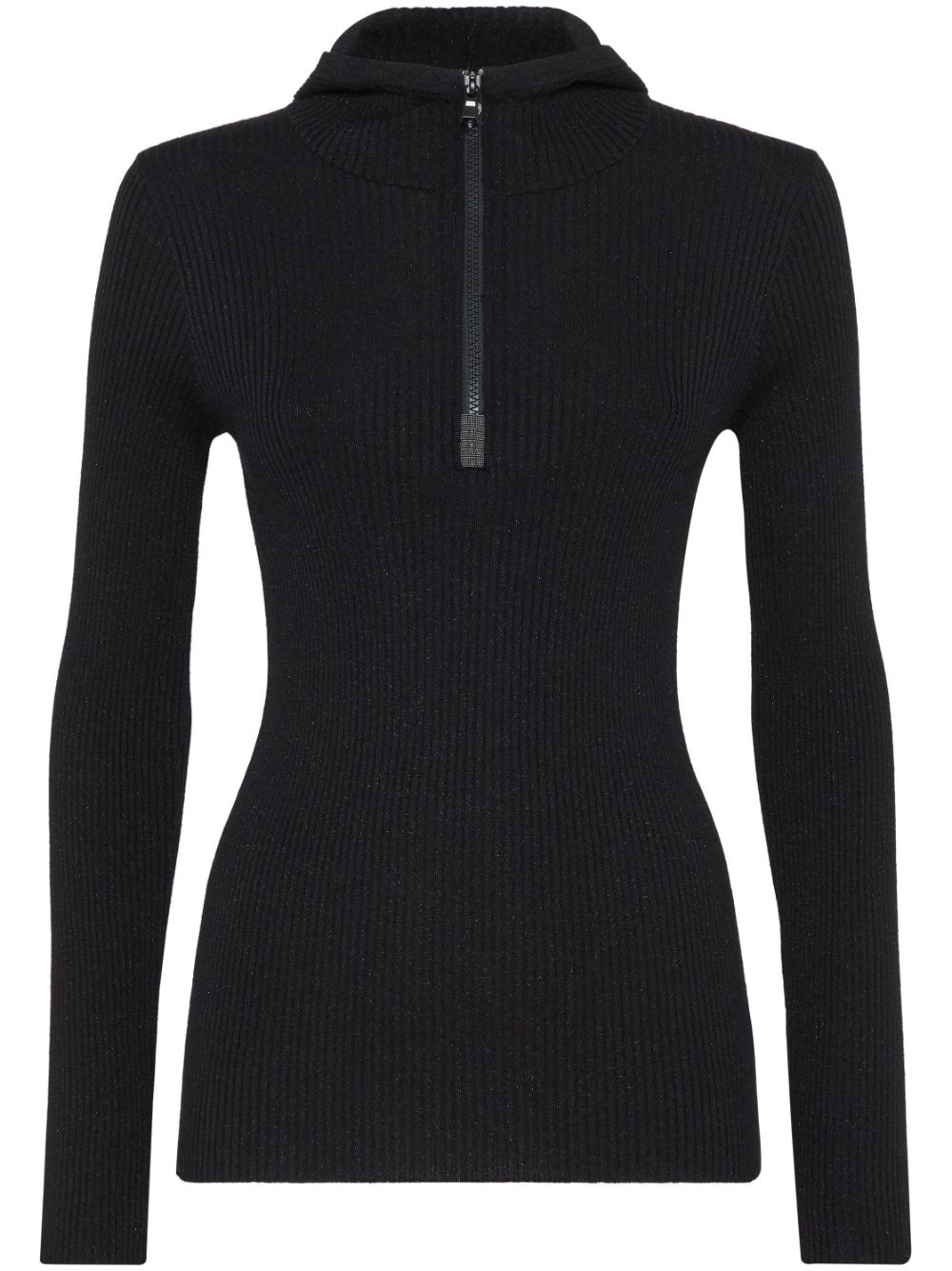 hooded ribbed knit sweater Highlights - Black - Cashmere blend - Ribbed knit - Lightweight - Classic hood - Short front zip fastening - Signature monili chain detail - Long sleeves - Straight hem Made in Italy Composition Cashmere 51%, Silk 22%, Polyamide 20%, Metallized Polyester 7%