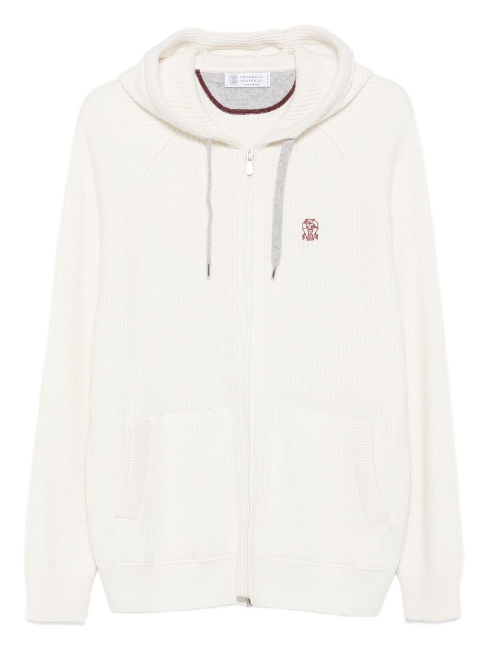 hooded ribbed zip-up cardigan Highlights - White - Ribbed knit - Zip fastening - Hooded neckline - Kangaroo pocket - Embroidered logo Made in Italy Composition Eco Brass 100%, Cashmere 100% SIZE & FIT Model measurements Height 6 ft 1 in(1.85 m) Bust/Chest 38.58 in(98 cm) Hips 37 in(94 cm) Waist 30.31 in(77 cm) Washing instructions Hand Wash