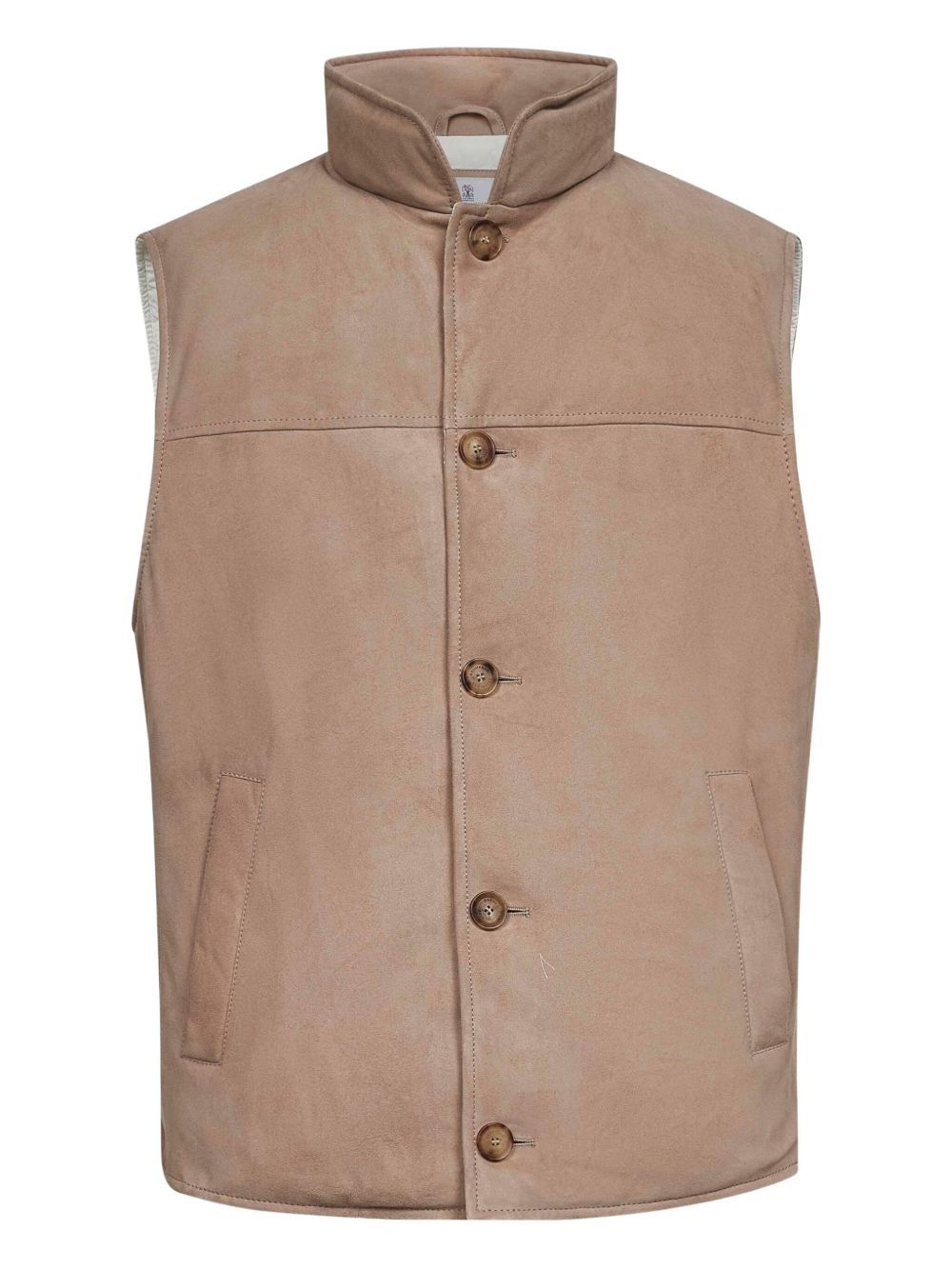 horn-button stand-collar gilet Highlights - Beige - Leather - Horn-button placket - Stand collar - Sleeveless - Slanted welt pockets Made in Italy Composition Calf Leather 100% Washing instructions Read Manufacturer Guidelines