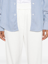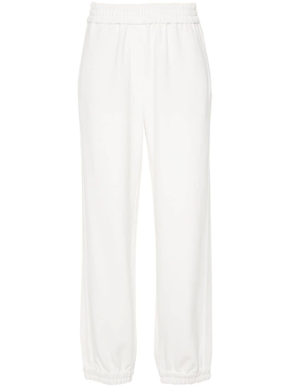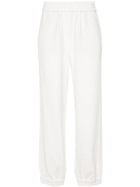 jersey track pants Highlights - White - Jersey texture - Elasticated waistband - Two side slit pockets - Two rear welt pockets - French terry lining - Elasticated ankles - Straight leg Made in Italy Composition Acetate 74%, Silk 26% SIZE & FIT Model measurements Height 5 ft 10 in(1.78 m) Bust/Chest 32.67 in(83 cm) Hips 35.43 in(90 cm) Waist 23.22 in(59 cm) FittingInformation Designed for a relaxed tapered cut, these trousers allow for a close fit at the waist and offer a loose fit at the thighs, with a closer fit toward the ankles The elasticated waist and hem offer a secure, comfortable fit Made from a midweight non-stretch fabric, this piece offers minimal elasticity when worn This piece fits true to size – take your usual size