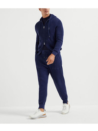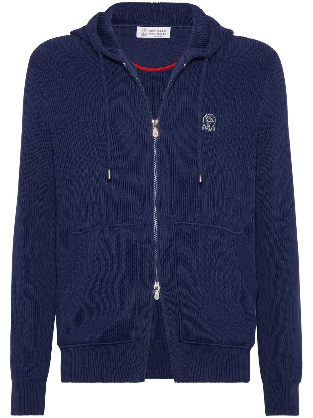 knitted hoodie Highlights - Navy blue - Front two-way zip fastening - Two front pouch pockets - Drawstring hood - Embroidered logo at the chest Made in Italy Composition Cotton 100%