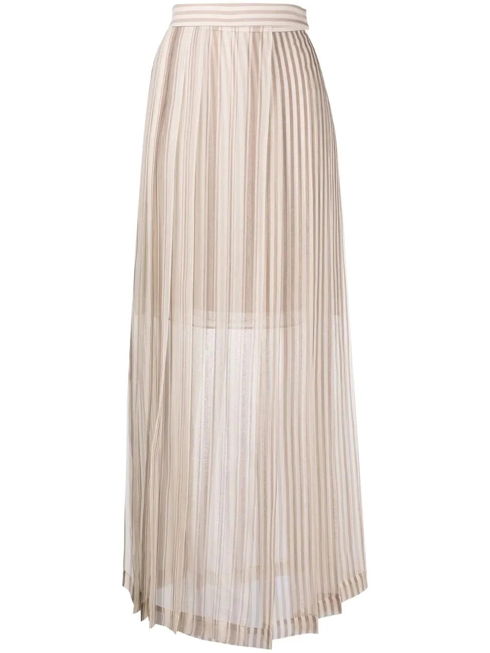 layered pleated maxi skirt beige silk high waist fully pleated semi-sheer panels layered design side slit Made in Italy Composition Outer: Silk 100% Lining: Acetate 74%, Silk 26% SIZE & FIT Model measurements Height 5 ft 9 in(1.75 m) Bust/Chest 32.67 in(83 cm) Hips 36.22 in(92 cm) Waist 24.8 in(63 cm) FittingInformation This piece fits true to size. We recommend you get your regular size Designed to be fitted at the waist and hips, loose over the leg Made with a mid-weight non-stretch fabric Washing instructions Dry Clean Only