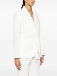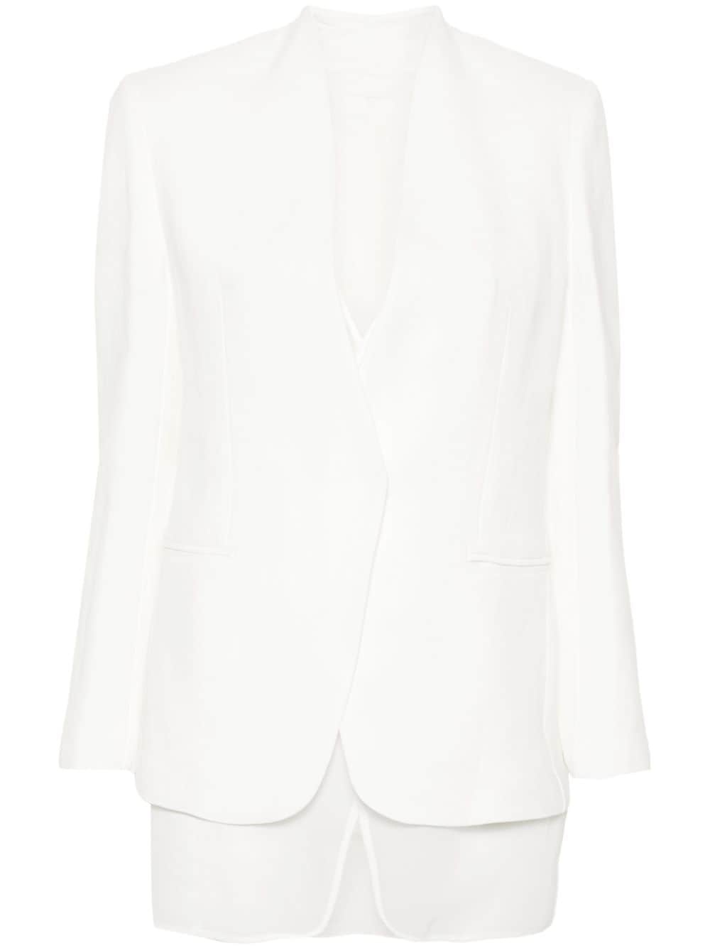 layered single-breasted blazer This white blazer from Brunello Cucinelli takes a contemporary approach to tailoring, achieved through its double-layered construction. Its sleek outer shell is cut to a collarless style and concealed front fastening for minimal appeal, while a translucent inner vest adds texture and dimension. Highlights - White - Double layer Made in Italy Composition Outer: Cotton 100%, Viscose 73%, Linen/Flax 27% Lining: Acetate 74%, Silk 26% SIZE & FIT Model measurements Height 5 ft 10 in(1.77 m) Bust/Chest 31.88 in(81 cm) Hips 36.22 in(92 cm) Waist 24.01 in(61 cm) FittingInformation Designed for a slim fit that sits just away from the body offering a close yet comfortable fit The internal shoulder pads offer a structured shape Made from a midweight non-stretch fabric This piece fits true to size – take your usual size