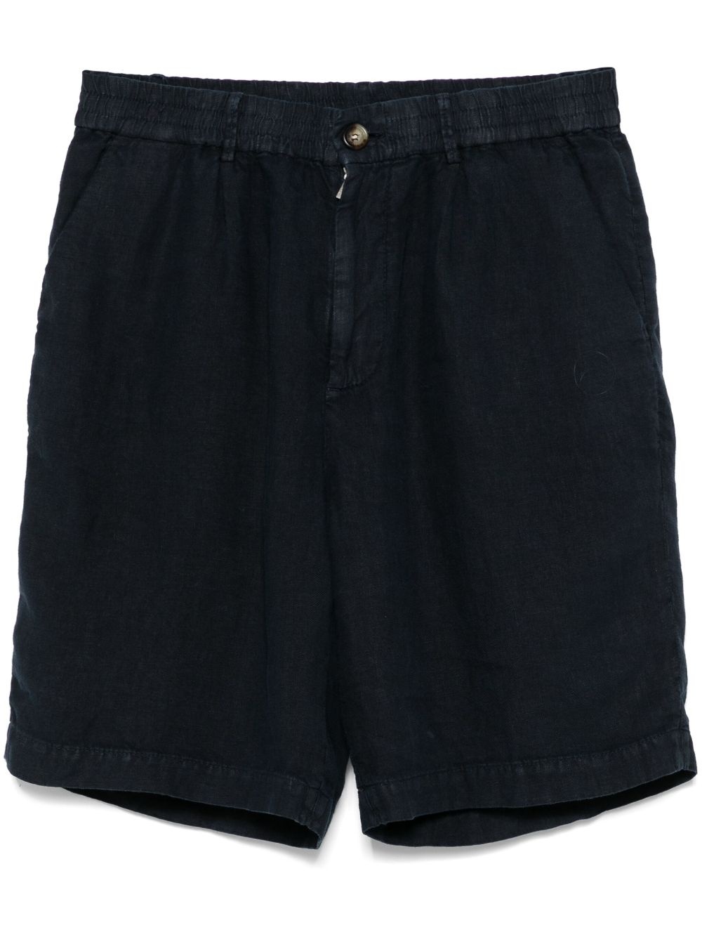 linen bermuda shorts Highlights - Navy blue - Concealed fly and button fastening - Elasticated waistband - Belt loops - Two diagonal pockets to the sides Made in Italy Composition Outer: Linen/Flax 100% Lining: Cotton 58%, Polyester 42% SIZE & FIT Model measurements Height 6 ft 2 in(1.87 m) Bust/Chest 38.97 in(99 cm) Hips 37.99 in(96.5 cm) Waist 29.52 in(75 cm) FittingInformation Designed for relaxed fit, offering a comfortable loose fit over the leg Made from a lightweight non-stretch fabric Washing instructions Machine Wash