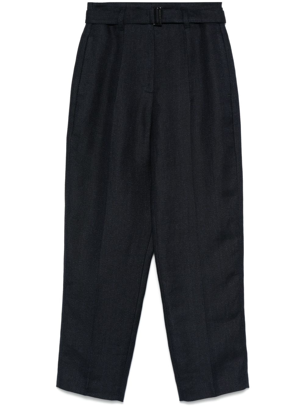 linen trousers Highlights - Navy blue - Concealed front button, hook and zip fastening - Belted waist - Two side inset pockets - Two rear welt pockets Made in Italy Composition Lining: Polyester 36%, Acetate 32%, Cupro 32% Outer: Linen/Flax 100%, Brass 100% SIZE & FIT Model measurements Height 5 ft 10 in(1.78 m) Bust/Chest 33.85 in(86 cm) Hips 36.61 in(93 cm) Waist 26.77 in(68 cm) FittingInformation Designed for a tapered fit, these trousers allow for a close fit at the waist and a loose unrestricted fit over the leg with a closer fit towards the ankle The belt offers adjustability for fitted preferences Made from a midweight non-stretch fabric