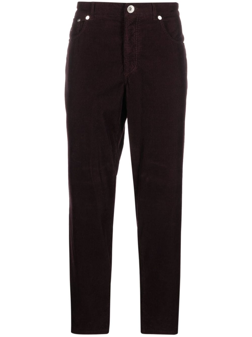 logo-embroidered corduroy trousers Highlights - Dark purple - Leather/cotton - Corduroy - Embroidered logo to the front - Concealed fly and button fastening - Classic five pockets - Cropped leg Made in Italy Composition Outer: Leather 100%, Cotton 100% Lining: Cotton 100% Washing instructions Machine Wash