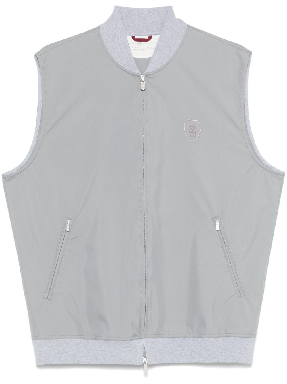 logo-print gilet Highlights - Light grey - Front two-way zip fastening - Two side zip-fastening pockets - Baseball collar - Sleeveless Made in Italy Composition Cotton 100%, Polyester 93%, Polyurethane 7% SIZE & FIT Model measurements Height 6 ft 2 in(1.89 m) Bust/Chest 35.03 in(89 cm) Hips 38.18 in(97 cm) Waist 29.92 in(76 cm) FittingInformation Designed for a slim fit, offering a comfortable fit that sits just away from the body The elasticated hem allows for movement and a comfortable fit Made from a midweight non-stretch fabric, this piece offers minimal elasticity when worn Washing instructions Machine Wash