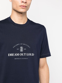 logo-print short-sleeve T-shirt logo-print short-sleeve T-shirt from BRUNELLO CUCINELLI featuring midnight blue, cotton, contrast stitching, logo print to the front, round neck, short sleeves and straight hem. Made in Italy Composition Cotton 100% SIZE & FIT Model measurements Height 6 ft 1 in(1.85 m) Bust/Chest 34.6 in(88 cm) Hips 36.2 in(92 cm) Waist 27.2 in(69 cm)
